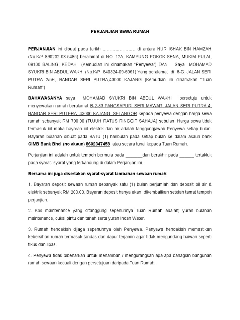 Contoh Perjanjian Sewa Rumah Yang Ringkas Dalam Word U0026 Pdf Perjanjian Sewa Bilik Doc